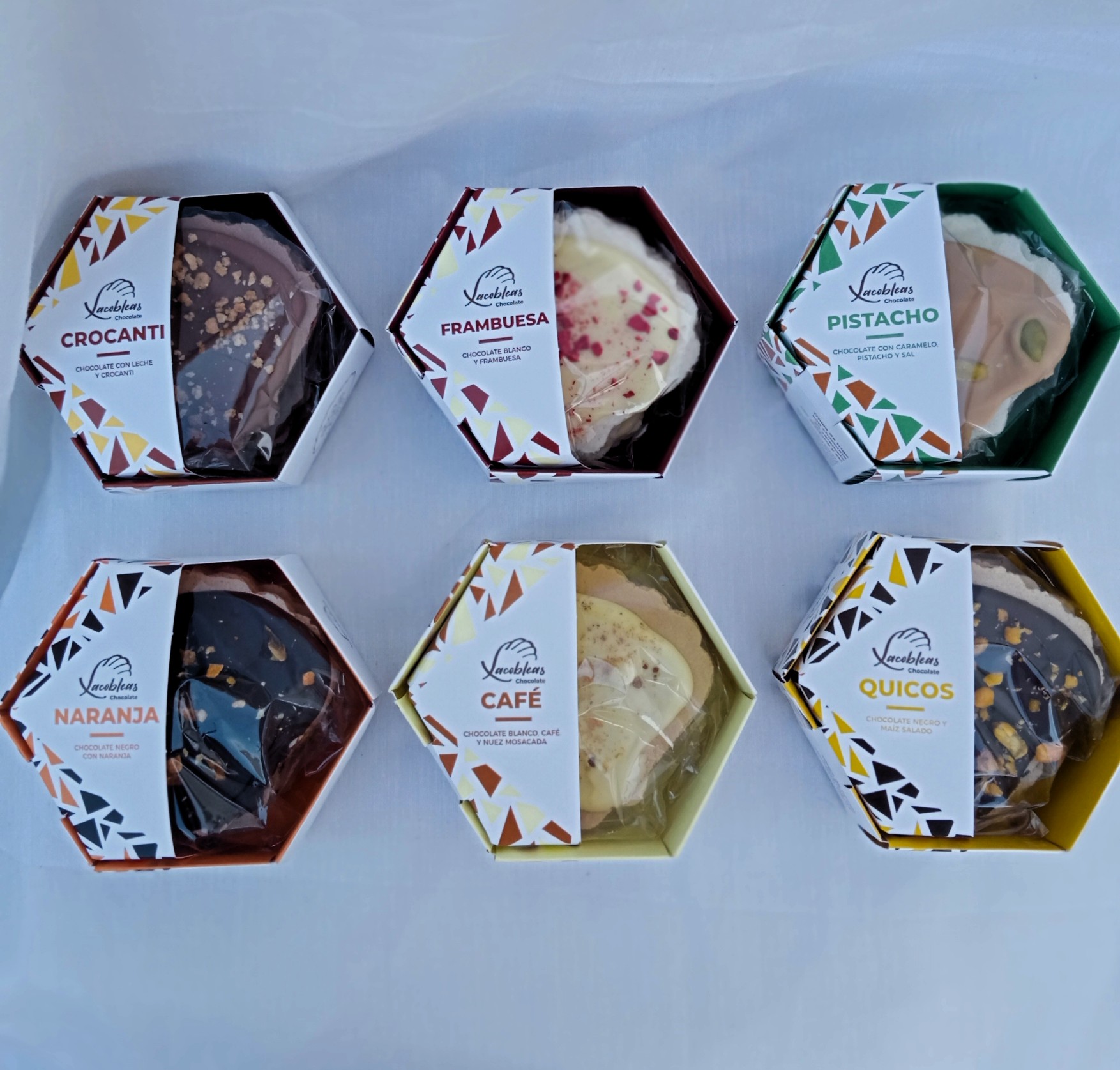 Formatos: Además de estas cajas de 6 unidades, tienes las bolsas degustación con 4 Xacobleas donde puedes probar un surtido de nuestros chocolates.